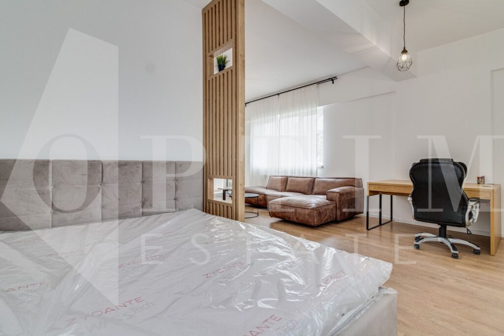 Studioul este mobilat și utilat premium, cu balcon deschis.