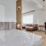 Studioul este mobilat și utilat premium, cu balcon deschis.